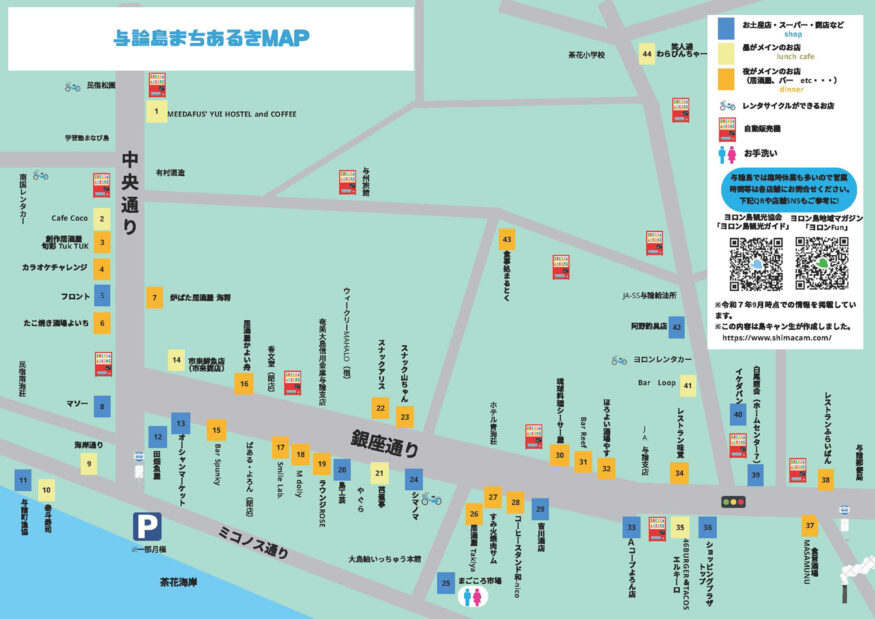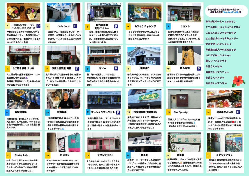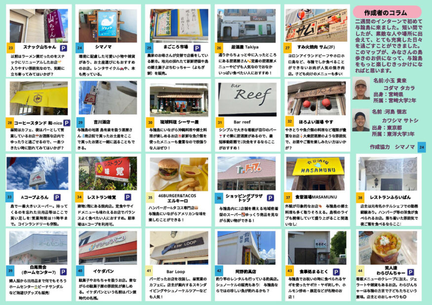 この夏、銀座通り商店街を中心にしたまちあるきMAPを島キャン生(大学生のインターン)が作成しました。ヨロン島観光協会のHPからもダウンロードできる他、宿や一部店舗などに置かれているので見かけたらぜひまちあるきの参考にしてくださいね!