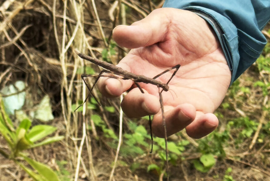 続いて大きなナナフシを見つけました。枝みたいで探すのは大変ですが、だんだん探すのがうまくなる子ども達。大きな個体はメス。ちいさな個体はオス。メスは卵を産むために身体が大きいそうです。