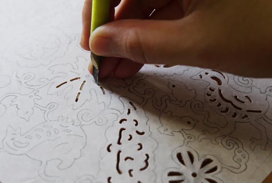若菜: 染める前の「型彫り」も時間かかりますね。型を自分で彫るんですが、点で彫っていくんですよ。缶切りの動きみたいな感じで。