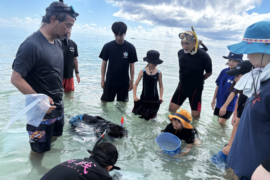 当日は水環境問題を研究している琉球大学の安元純先生と、太古の気候変動を中心に研究している東北大学の浅海竜司先生の2名を講師に、参加したヨロン島の小学生及び保護者に向けて講話をいただいた後、海に行って海底湧水を実際に体感するという流れで行われました。