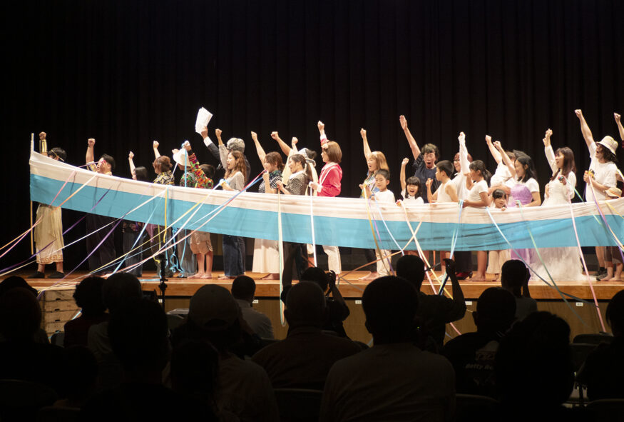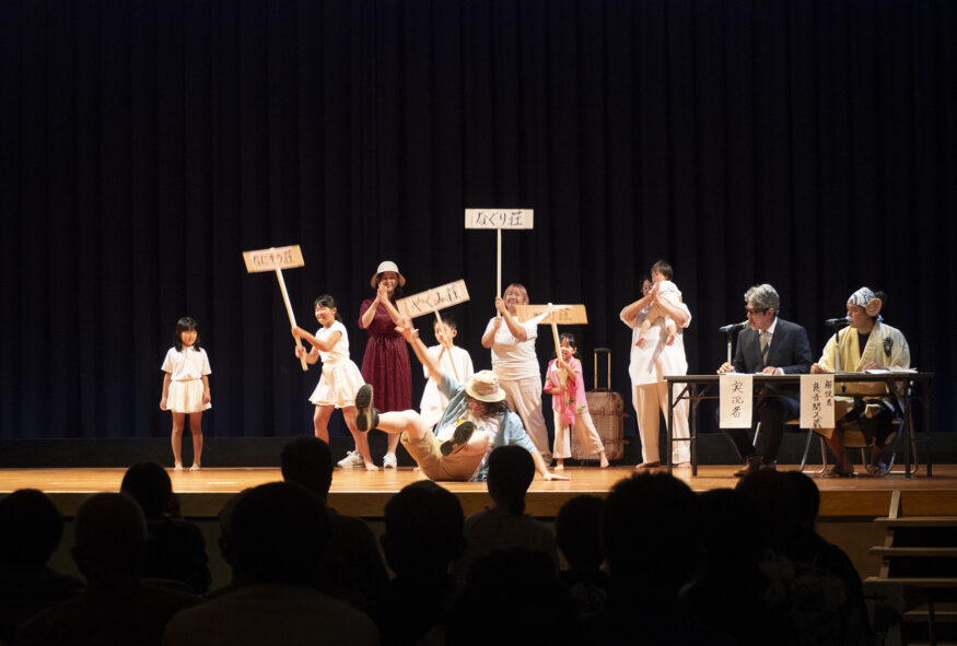 インタビュー映像の間に劇団 野生の島人が登場。島内のミュージカルグループやダンスグループなども加わり総勢およそ50名のメンバーが参加。今日の式典のために作られた劇は架空のテレビ番組「タイムトラベル IN JAPAN 与論島編」と題し、これまでの島の歩みを会場の皆と一緒に楽しく振り返る内容でした。